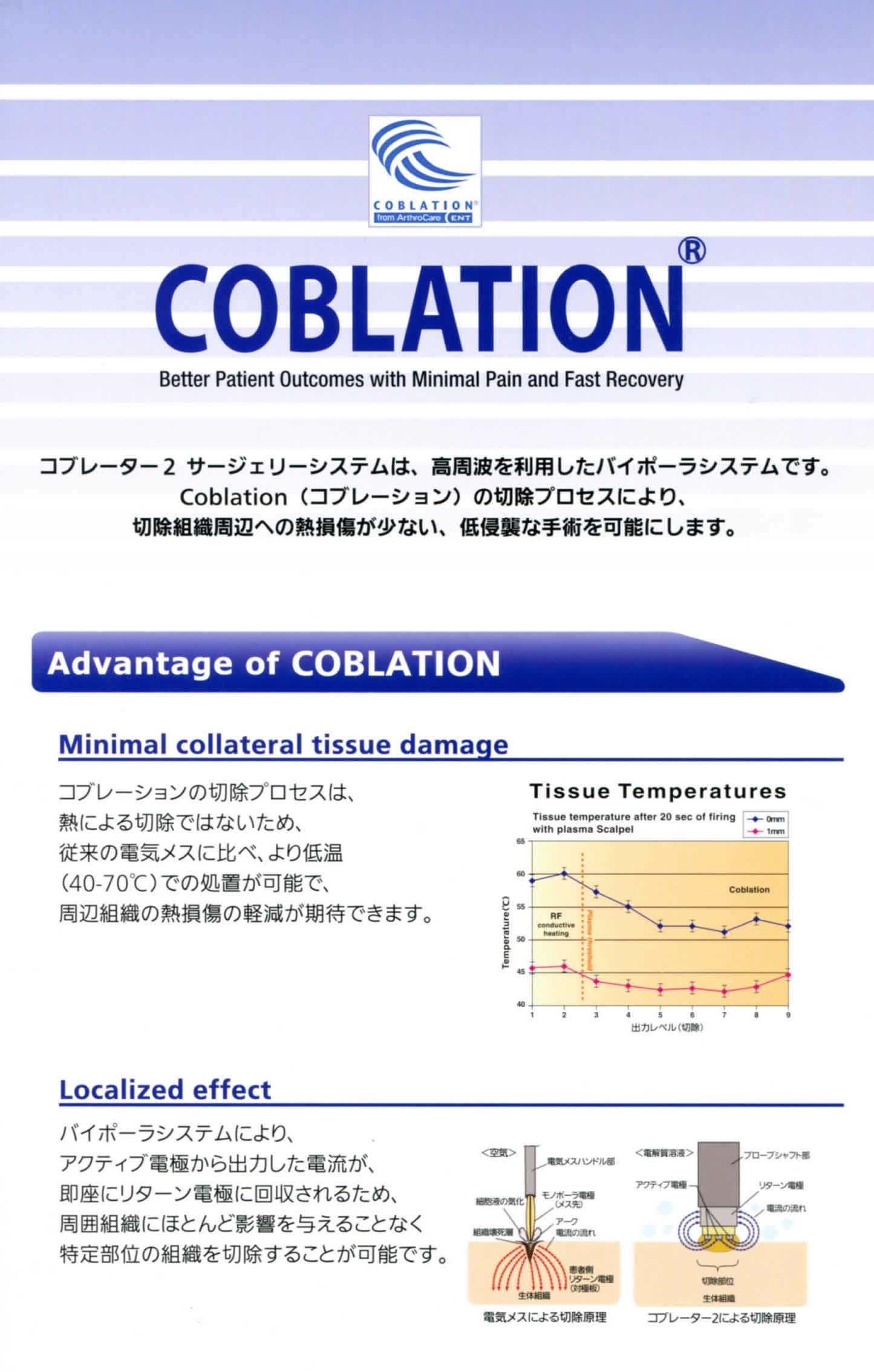 | コブレーション(Coblation)手術はラジオ波を利用した凝固手術です。鼻粘膜や扁桃組織の肥大した部位にワンドと呼ばれる針電極を刺します。ラジオ波を利用して非常に低い熱を組織にあたえ肥大組織を縮小させるものです。約1ヶ月かかって凝固が完了します。日帰り手術です。Coblatorの導入は北海道内では2医療機関ありますがコブレーションによる粘膜収縮手術は当院のみ実施しております(2004.4.9現在)。 |